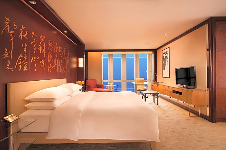 Floor-to-ceiling windows offering sweeping views of the Pudong skyline welcome you to a 40-square-yard luxury accommodations on a private concierge floor offering elegant Art Deco design with a generous work area, high-speed wireless Internet, marble bath with robes, high-pressure shower tower, separate deep-soaking bathtub and king bed with feather down duvet. Includes access to the Grand Club Lounge offering a private boardroom and serving breakfast, evening cocktails and hors d'oeuvres.
